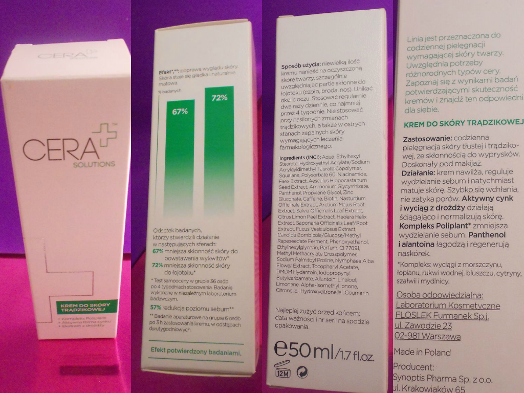 Cera+Solutions, dziś będzie o kremie do skóry trądzikowej.Niestety nie należę do szczęśliwych posiadaczy nieskazitelnej i czystej cery. W przerwach leczenia u dermatologa, sięgam po kremy przystosowane do mojej cery czyli z skłonnością do trądziku. I tak oto od niedawna posiadam ten krem do twarzy, po ponad 3 tygodniach stosowania mogę powiedzieć o nim co nieco i myślę, że jeśli borykacie się z problemem podobnym do mojego ten krem może was zainteresować. Krem można kupić w aptece ja polecam kupno jego tutaj