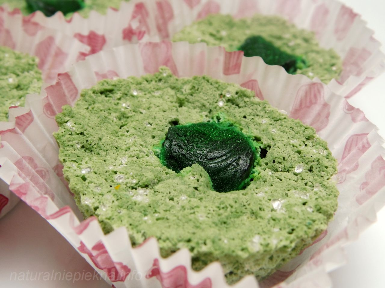 • Gdy już uzyskaliśmy pożądaną konsystencje kul kąpielowych przekładamy je do foremek na babeczki. Mocno ugniatamy by były jak najbardziej zbite.