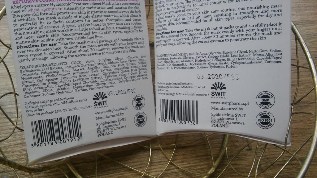 | Składy : Maseczka hialurynowa / Maseczka kolagenowa |