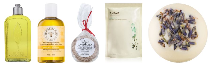 | L’Occitane Verveine piana do kąpieli / Burt’s Bees Baby Bee oliwka do kąpieli / Soaphoria Milky Touch regenerująca kula do kąpieli / Ahava Dead Sea Salt / Greenum Lavender kremowa kula do kąpieli |