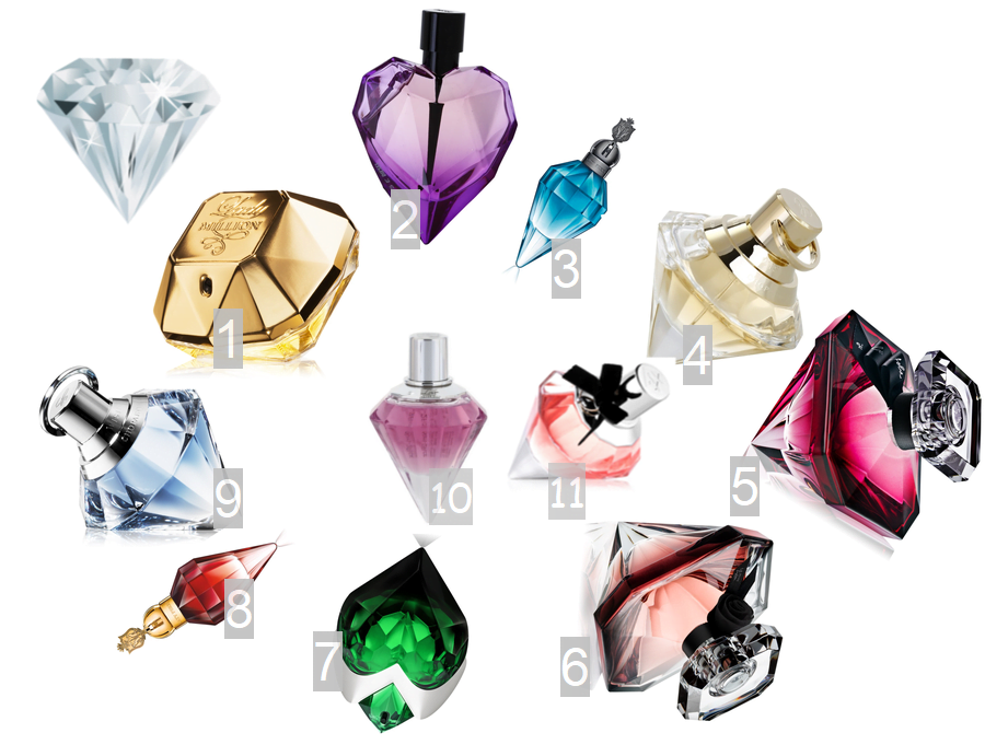 Zdecydowanie wśród zapachów które ukryte są w diamentowych kształtach, króluje znana i lubiana Lady Million od Paco Rabanne. Dużym powodzeniem cieszą się również zapachy z serii La Nuit Trésor od Lancôme. Ciekawą i nieco tańszą opcją są perfumy marki Chopard, natomiast w niskiej cenie możemy znaleźć perfumy znanej piosenkarki Katy Perry czy też perfumy marki