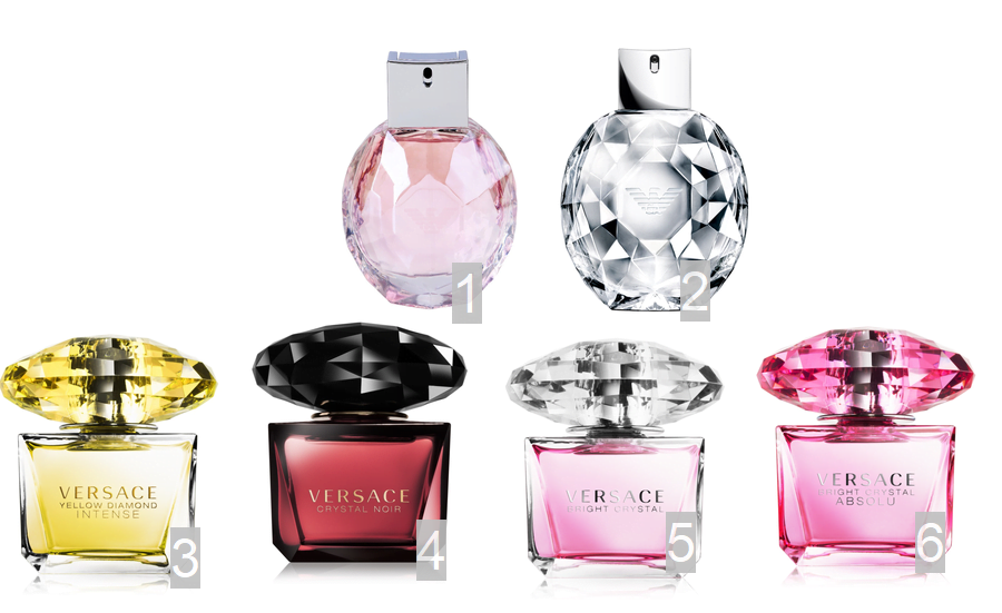 Nie da się ukryć, że bardzo charakterystyczny kształt diamentowej zatyczki perfum, znajdziemy w wielu wariantach zapachowych Versace. Diamentowe nie tylko z kształtu ale i z nazwy są perfumy z Emporio Diamonds od Armaniego.